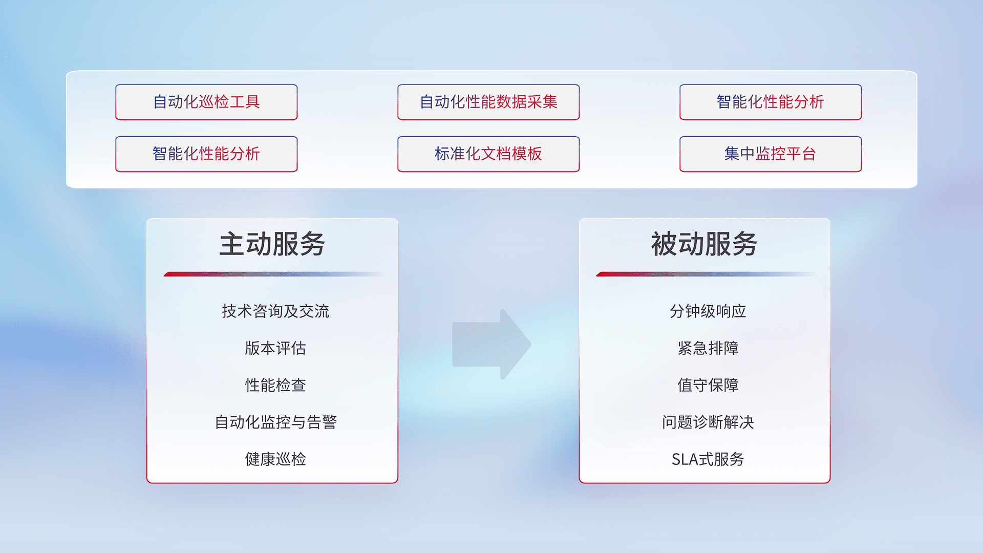 智能化工具和标准化文档,,,,保障服务质量,,,提供主动服务(包含技术咨询、、、版本评估、、、、性能检查、、、、自动化监控与告警、、、健康巡检)和被动服务包含(分钟级响应、、紧急排障、、值守保障、、、问题诊断解决、、、、SLA服务)。。。。